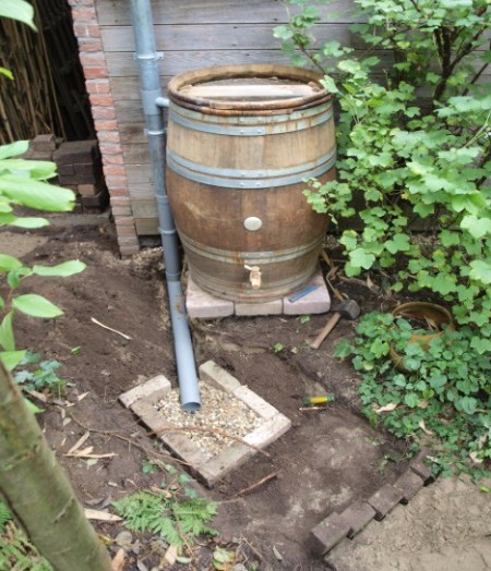Combinatie van een regenton en een grindkoffer onder een tuinpad
